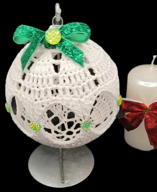 Ręcznie robiona bombka na stojaku – elegancka dekoracja świąteczna Wyjątkowa bombka wykonana na szydełku, ozdobiona ...